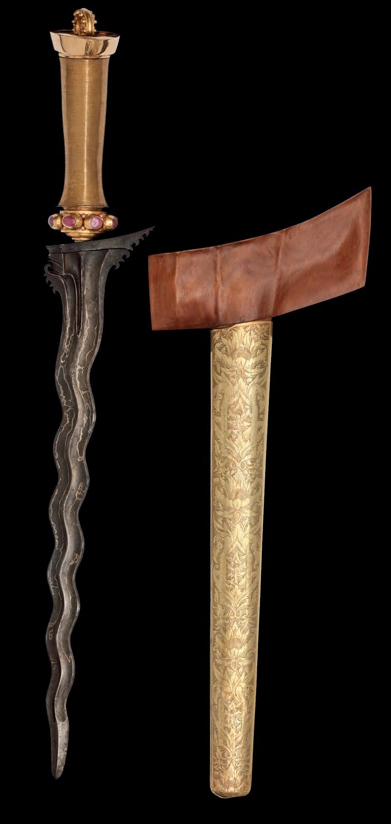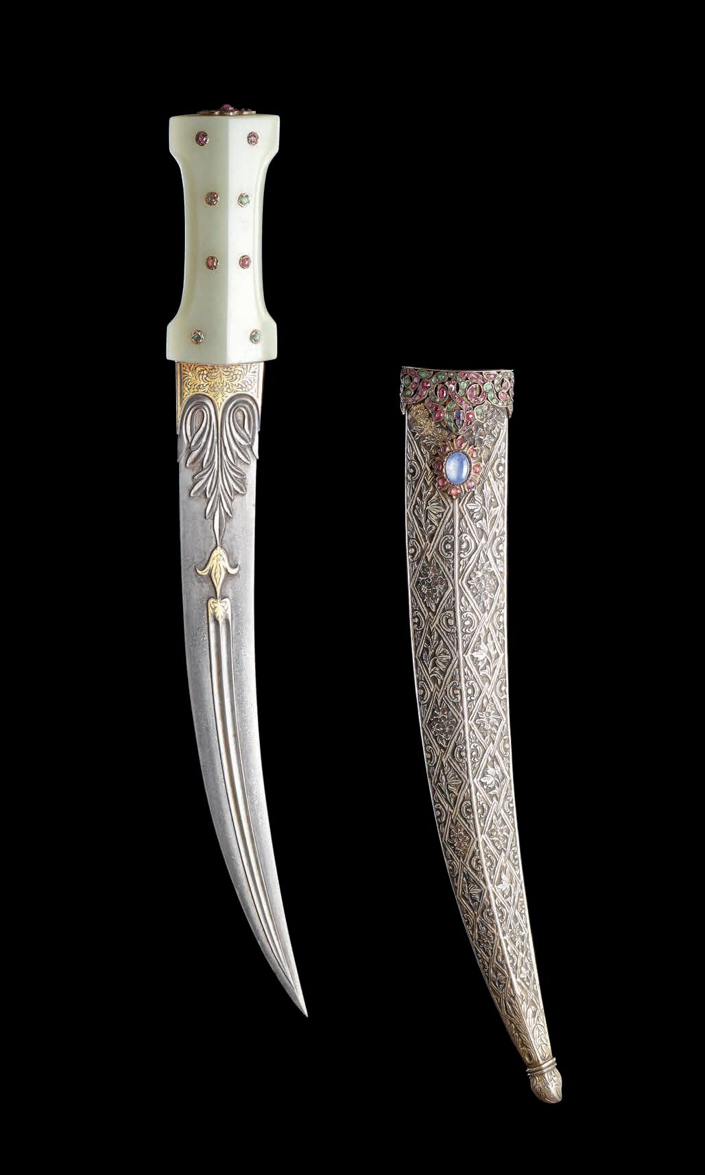 This opulent hançer, or dagger, represents a fine example of this weapon type and is well preserved. These ceremonial weapons are known to have been presented to Edward VII and are preserved in the Royal Collection Trust today. Similar daggers, such as some with calligraphic inscriptions, can be seen in the Metropolitan Museum of Art (access. no. 36.25.994) and the British Museum (access no. 1878,1230.902). Blades like the one present are tempered in such a way as to display distinctive motifs of banding and mottling, which are reminiscent of flowing water. In addition, they are resistant to shattering and can be honed to a sharp, resilient edge. For a comparable dagger, see: Alexander, Islamic Arms and Armor in the Metropolitan Museum of Art, no. 79.