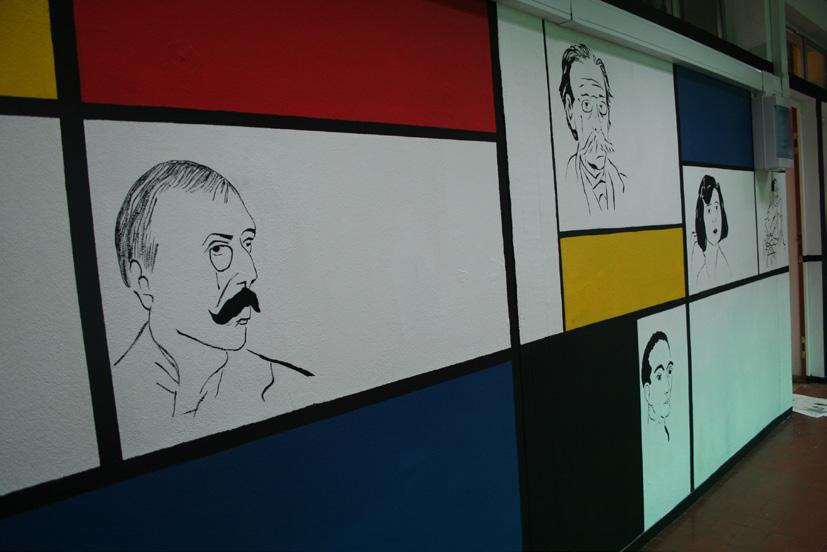 Esta “recriação” de Mondrian serviu de base e fundo para a sobreposição de rostos, frases e dizeres de pintores e escritores, servindo estes como “figurinos” na tela.