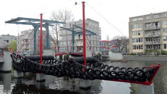 maatwerk, de rest is standaard. De verscheidenheid aan woonbo ten in Amsterdam strekt zich uit van varende schepen en schar ken – een soort platbodems met opbouw – tot arken die al dertig jaar niet van hun plek zijn geweest. Wat gebeurt er als je die gaat verslepen? Regelmatig zie ik een woonboot die ooit ter plekke is opgebouwd en niet onder een brug door past. Je kunt zo’n boot dan nagenoeg alleen nog verplaatsen binnen het rak. Je komt ook van alles tegen: tuintjes, schuren, terrassen, vlon ders en bijbootjes, vergund of niet.’