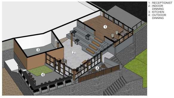 : : This project reimagines the expansion of an existingrestaurantintoadynamicvenuethat seamlessly integrates dining and recreation through the addition of a modern billiard center. The architectural concept balances functionalitywithaestheticappeal,creatinga cohesive space where culinary experiences andleisureactivitiescoexistharmoniously