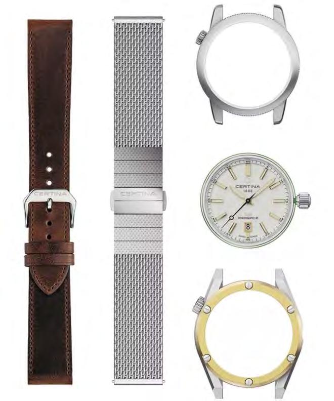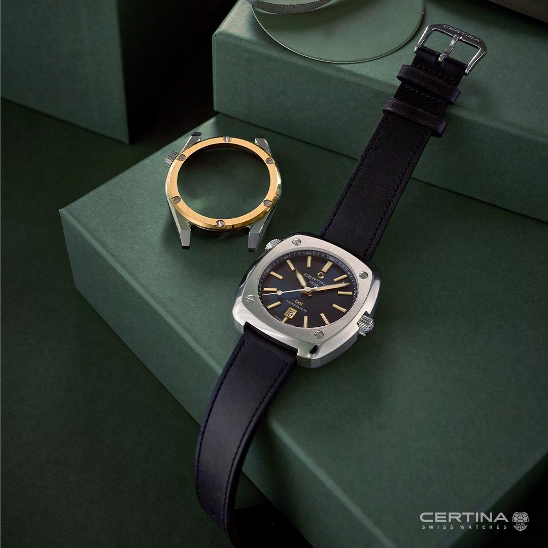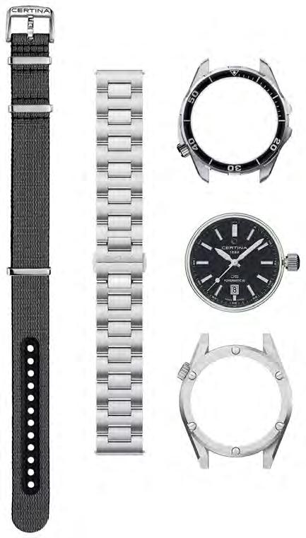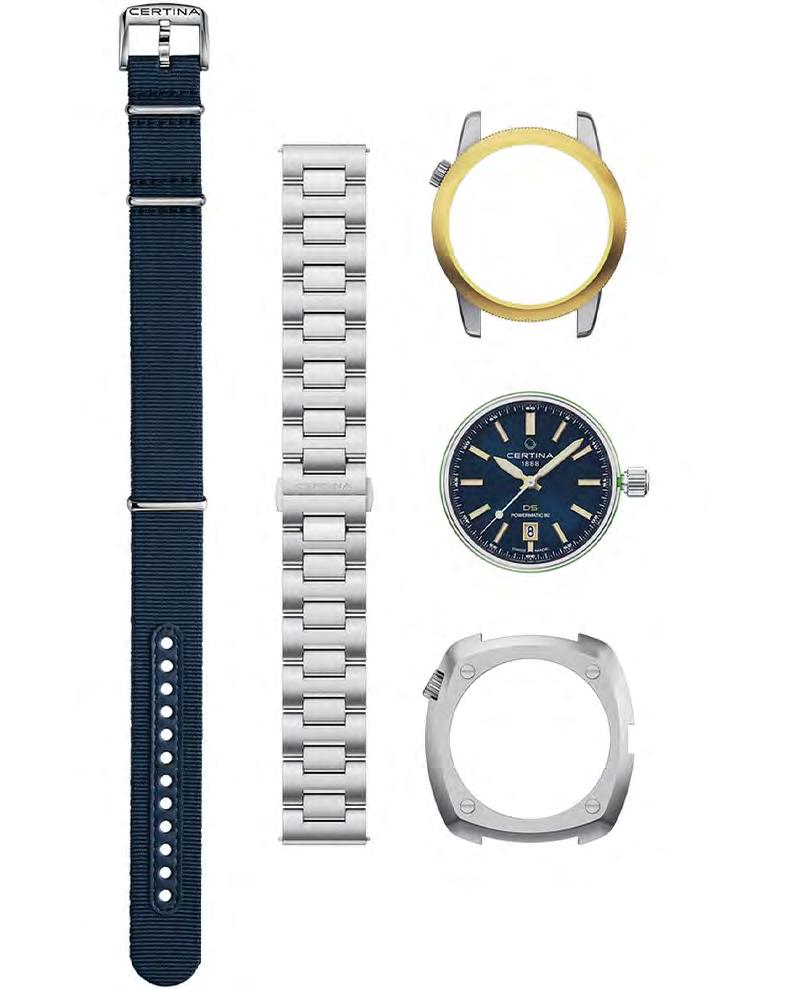 Kolekcja zegarków Certina DS+ to innowacja na skalę światową. To nie tylko jeden zegarek, to aż cztery możliwe kombinacje. W jego skład wchodzą: jedno wnętrze zegarka, dwiestalowe koperty, materiałowy pasek oraz bransoleta ze stali szlachetnej. Można je dowolnie łączyć, sam proces jest intuicyjny i nie wymaga wizyt u zegarmistrza. Pod szkłem szafirowym umieszczono niebieską tarczę z datownikiem dni miesiąca oraz powłoką luminescencyjną na wskazówkach i indeksach. Dokładne działanie całości zapewnia mechanizm automatyczny Powermatic 80 z liczącą 80 godzin rezerwą. Wodoszczelność wynosi 200 metrów.