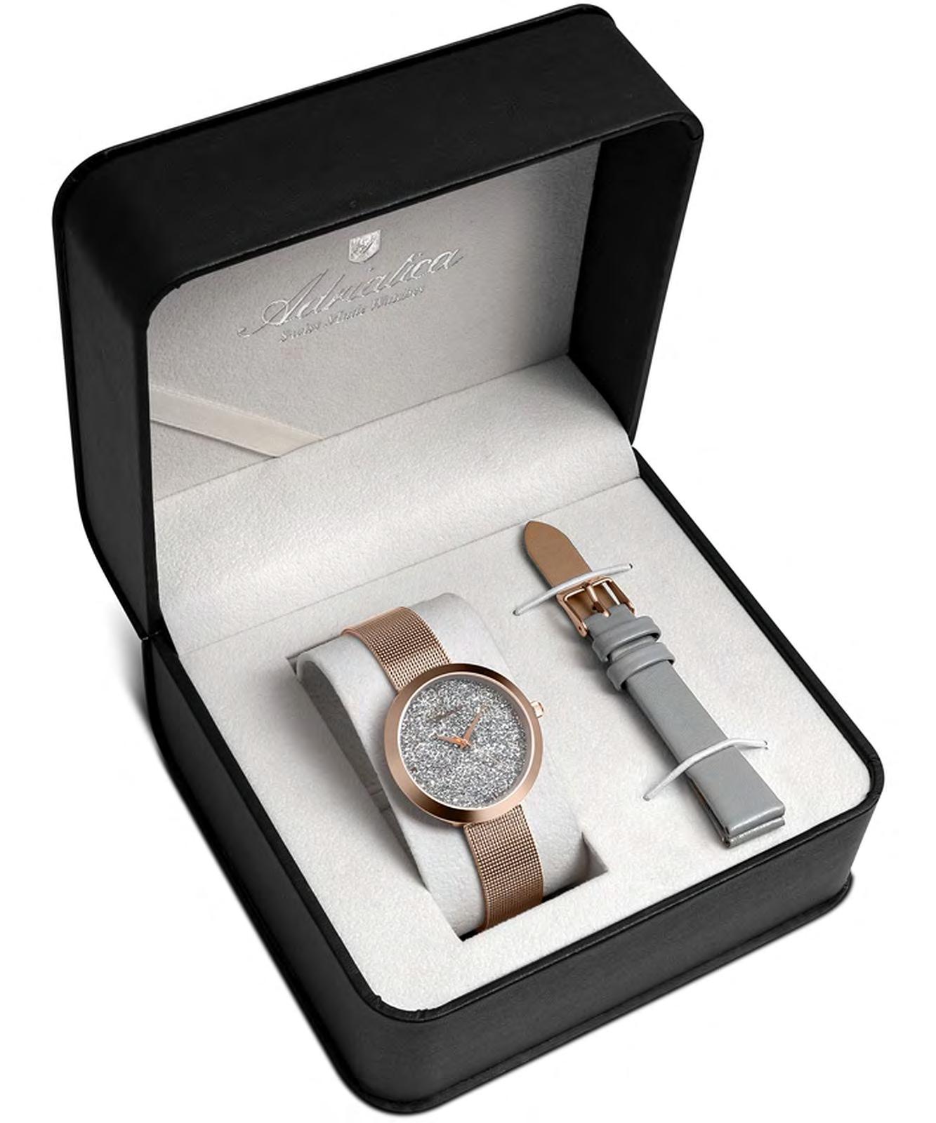 Adriatica Fashion to stylowy damski zegarek. Model ten działa w oparciu o szwajcarski mechanizm kwarcowy Ronda 783. Jego różowozłotą kopertę wykonano ze stali szlachetnej i zawieszono na takiej samej bransolecie mesh. Szarą okrągłą gustownie ozdobioną tarczę urządzenia przykryto szkłem mineralnym. Zegarek jest sprzedawany w zestawie prezentowymdołączono do niego szary pasek ze skóry.