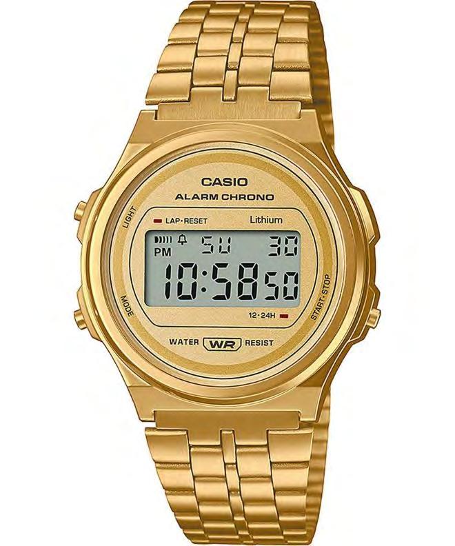Zegarek Casio jest modnym dodatkiem o ciekawym, ponadczasowym designie. Cały model utrzymano w złotej kolorystyce. Zaletą są różnorodne funkcje m.in.: podświetlenie diodą LED, stoper - 1/100 sek., alarm, automatyczny kalendarz z datą, wskaźnik dnia tygodnia, wskaźnik miesiąca oraz czas 12-/24-godzinny.