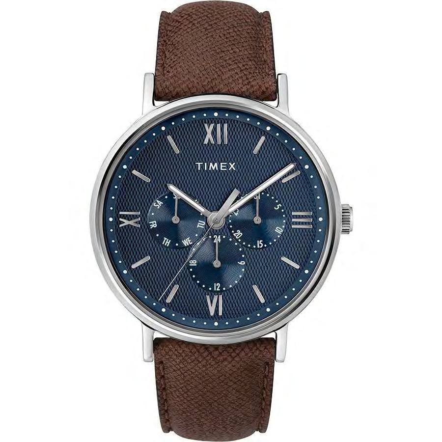 Zegarek męski Timex Southview TW2T35100 to model idealny jako dopełnienie ubioru w stylu smart casual. Okrągła koperta z mosiądzu w kolorze srebrnym została zestawiona z brązowym paskiem wykonanym w naturalnej skóry oraz niebieska tarczą przykrytą szkiełkiem mineralnym. Urządzenie posiada ponadto datownik dni miesiąca, datownik dni tygodnia, wskaźnik czasu dobowego oraz powłokę luminescencyjną na wskazówkach.