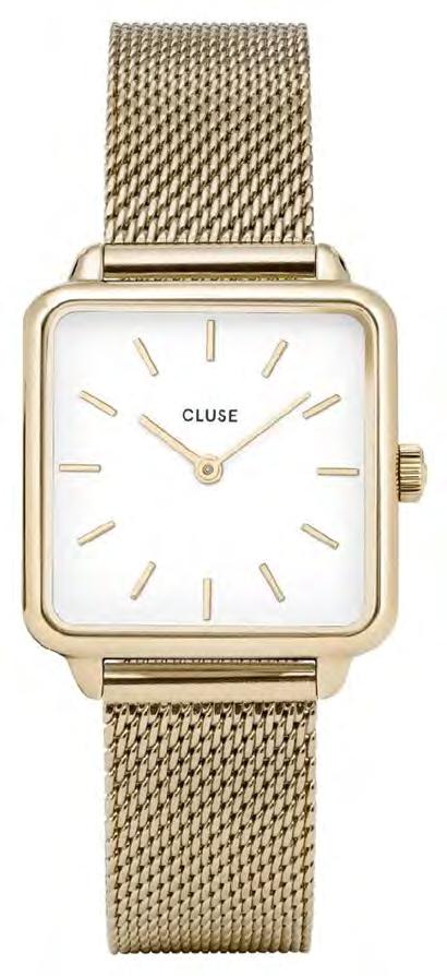 Na zegarek damski Cluse składają się kwadratowa koperta ze stali szlachetnej w kolorze złota oraz utrzymana w tym samym odcieniu stalowa bransoleta w formie siatki. W kopercie umieszczono biały cyferblat przykryty szkiełkiem mineralnym, którego twardość została oceniona na pięć punktów w dziesięciostopniowej skali twardości Mohsa.