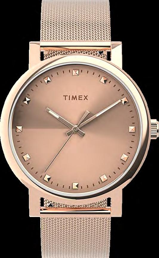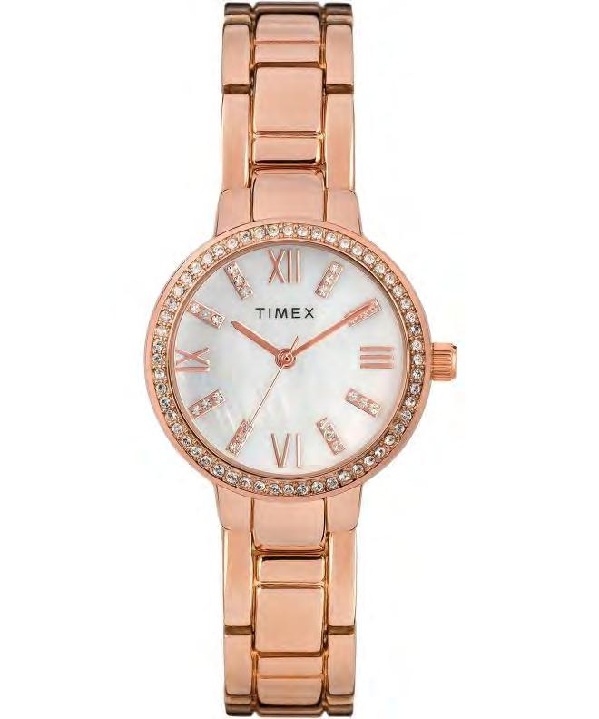 Timex Essential Originals TW2U05500 to zegarek w najmodniejszym kolorze ostatnich lat. Okrągłą kopertę odlano z wysokiej jakości mosiądzu (o niskiej zawartości ołowiu), którą dodatkowo pokryto powłoką w kolorze różowego złota. Analogowy cyferblat wyposażono w wyraźne wskazówki i indeksy oraz logo marki koło godziny dwunastej. Tarczę zabezpieczono elastycznym szkłem mineralnym. Produkt objęto dwuletnią gwarancją producenta.