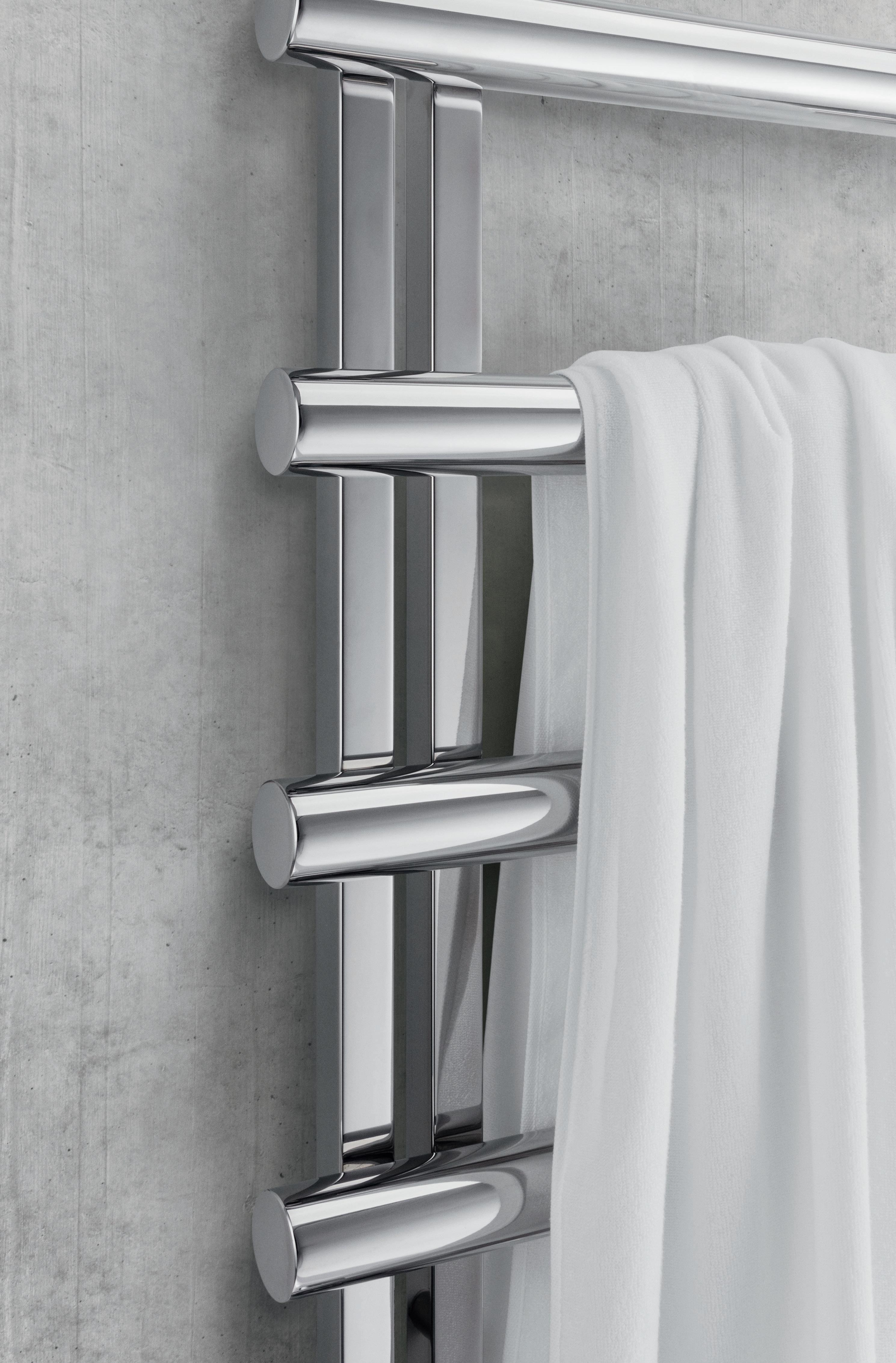 This stainless steel towel warmer looks fabulous in contemporary interiors. Great for wet rooms and family bathrooms alike, the cantilevered rails allow space for the plumpest of towels and the radiator can be installed with the rails to the right or left.