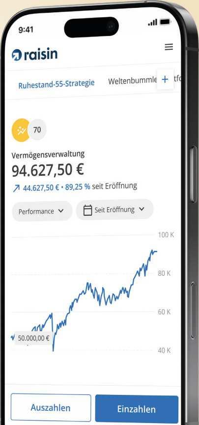 Ein Angebotder Raisin Bank AG.Anlagen in WertpapiereunterliegenWertschwankungen.Bitte beachten Siedie Risikohinweise auf weltsparen.de/risikohinweise.Weitere Informationenzuden Teilnahmebedingungen findenSie aufunserer Website.