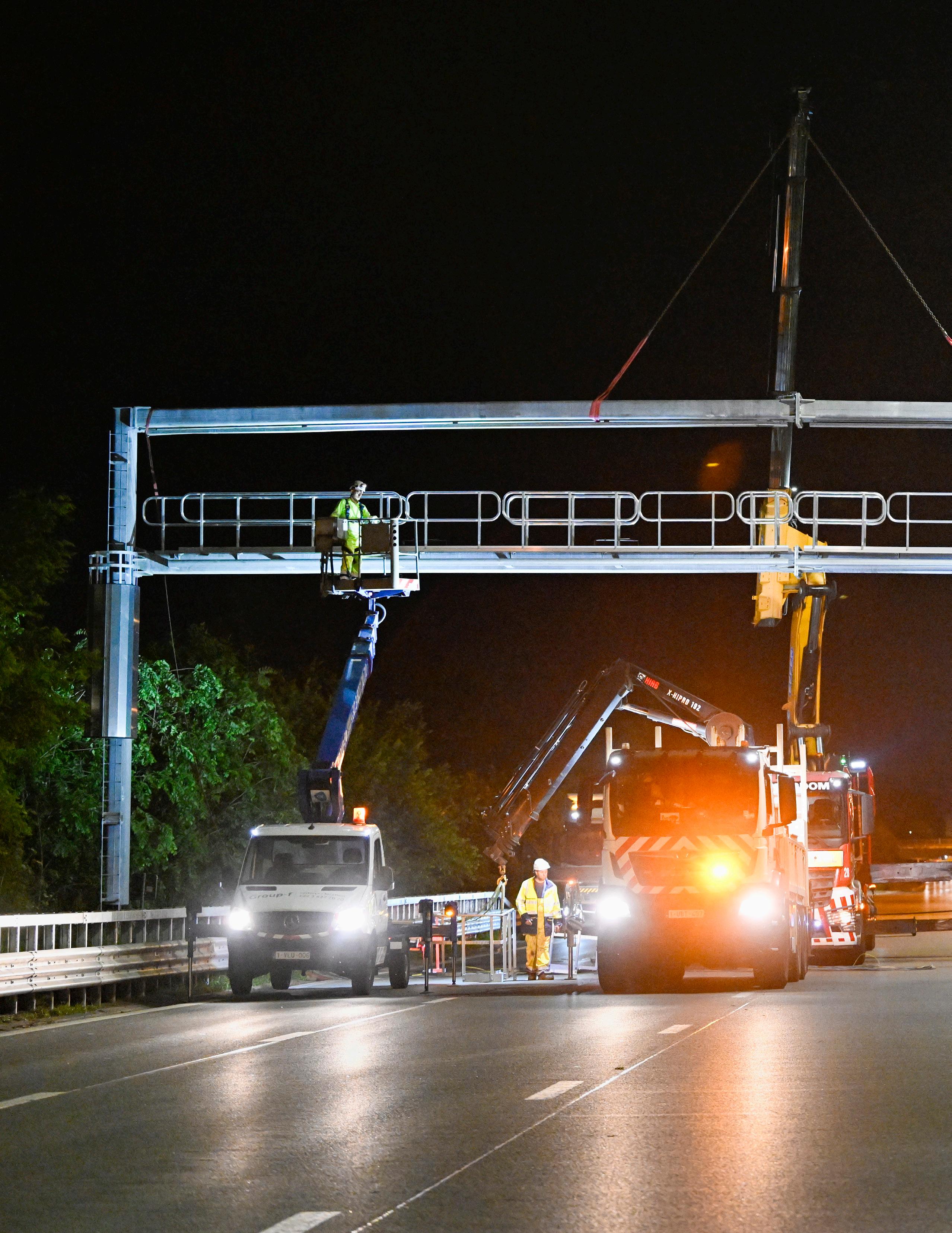 We beschikken enerzijds over dubbele liggerportieken waaraan we alle dynamische signalisatieborden bevestigen. Anderzijds passen we ook geregeld de zogenaamde galgpalen toe met maar één steunpoot. Soms vragen uitzonderlijke omstandigheden ook uitzonderlijke constructies. Zo werden in 2022 twee galgpalen met een extreem grote overspanning geplaatst aan de Leonardtunnel, meer bepaald ter hoogte van beide inrijzijdes van de tunnel. Soms kan er gewoon geen middenpoot geplaatst worden bij gebrek aan ruimte en moet je een overspanning van circa 40 meter overbruggen.