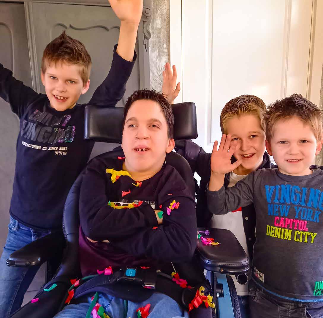 Na zijn geboorte viel op dat Jesse een schisis had en kleine laagstaande oortjes. Hij voelde slap en huilde nooit. Ook lag hij vaak in een overstrekte houding en maakte hij geen oogcontact. Drinken uit een fles lukte niet, want hij had geen zuigreflex en zijn schisis belemmerde het zuigen bovendien. Toen hij twee weken oud was, werd hij onderzocht door de klinisch geneticus. Ze dacht aan een syndroom, vanwege zijn aangeboren afwijkingen. Maar een diagnose bleef uit, waardoor het heel onzeker was of Jesse zich zou gaan ontwikkelen. Wat een feest toen Jesse op eenjarige leeftijd reik- en grijpbewegingen maakte naar zijn spiegelmobiel! Elke stap in zijn ontwikkeling was er één en wat genoten we van ons blije, guitige mannetje. De voedingsproblemen bleven. Bij het plaatsen van een PEG-sonde bleken Jesses zijn darmen niet goed aangelegd. Rond zijn twaalfde jaar kreeg hij last van een scoliose. Met als gevolg meer longproblemen, waarvan hij steeds moeilijker herstelde en waardoor vaak op de IC lag. We moesten nadenken over de toekomst en beslissen of een operatie aan zijn scoliose een optie zou zijn. We hadden behoefte aan ervaringen, herkenning en een diagnose. Ook voor de drie broertjes van Jesse wilden we nog een keer genetisch onderzoek aanvragen. Dit keer, twaalf jaar later, kwam uit het Whole Exome Sequencing (WES)-onderzoek de diagnose het Bohring-Opitz-syndroom (BOS). Met de diagnose konden we op zoek naar meer informatie en lotgenoten. We vonden herkenning in de verhalen van de ouders in de Bohring-Opitz-Syndrome-support group. Hadden we de diagnose eerder gehad, dan waren de gezondheidsproblemen eerder herkend en beter behandeld. Want het was een zoektocht… Niet alleen in de wereld van zorg, hulpmiddelen en voorzieningen, maar bovenal naar een fijn en plezierig leven voor Jesse. Nu, vijftien jaar later, Jesse als grote stoere broer tevreden te zien zitten tussen zijn drie broertjes, geeft mij een enorm trots en warm gevoel!