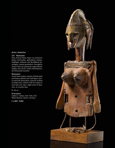 Mali, Bamana 272 Marionette Holz, braune Patina, Reste von schwarzer Farbe und Kaolin, geflochtene Schnur, Halbfigur, teilweise mit Metallblech beschlagen, separat gearbeitete, bewegliche Arme, Frisur aus paarweise angeordneten Zöpfen, min. besch., leichte Abriebspuren, auf Holzsockel montiert Marionette wood, brown patina, remains of black paint and kaolin, plaited cord, half figure, partly stud with metal sheet, seperate worked movable arms, coiffure with two plaits on each side, min. dam., slight traces of abrasion, on wooden base H: 38 cm Provenance Gallery L. Kahan, New York, USA Walter Bareiss, Salach, Germany € 4.500 - 9.000