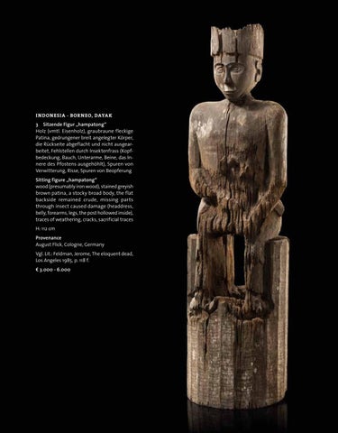 3 Sitzende Figur „hampatong“ Holz (vmtl. Eisenholz), graubraune fleckige Patina, gedrungener breit angelegter Körper, die Rückseite abgeflacht und nicht ausgearbeitet, Fehlstellen durch Insektenfrass (Kopfbedeckung, Bauch, Unterarme, Beine, das Innere des Pfostens ausgehöhlt), Spuren von Verwitterung, Risse, Spuren von Beopferung Sitting figure „hampatong“ wood (presumably iron wood), stained greyish brown patina, a stocky broad body, the flat backside remained crude, missing parts through insect caused damage (headdress, belly, forearms, legs, the post hollowed inside), traces of weathering, cracks, sacrificial traces H: 112 cm Provenance August Flick, Cologne, Germany Vgl. Lit.: Feldman, Jerome, The eloquent dead, Los Angeles 1985, p. 118 f. € 3.000 - 6.000