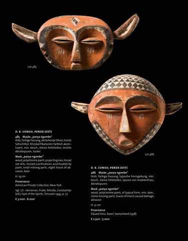 485 Maske „panya ngombe“ Holz, farbige Fassung, abstehende Ohren, breite Sehschlitze, Ritzskarifikationen farblich akzentuiert, min. besch., kleine Fehlstellen, leichte Abriebspuren, Sockel Mask „panya ngombe“ wood, polychrome paint, projecting ears, broad see slits, incised scarifications accentuated by paint, small missing parts, slight traces of abrasion, base H: 19 cm Provenance American Private Collection, New York Vgl. Lit.: Herreman, Frank, Petridis, Constantijn (ed.), Face of the Spirits, Tervuren 1993, p. 77 € 3.000 - 6.000