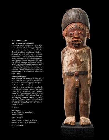381 Stehende männliche Figur Holz, matte Patina, farbige Fassung, kräftiger Körper, Gesicht mit stammestypischen Charakteristika, min. besch., kleine Fehlstellen (Zehen), feine Risse, Abriebspuren, Sockel; die westlichen Kuyu vergleichen ihren Häuptling mit einem Panther und in den Initiationszeremonien werden die Geheimnisse seiner Kraft gelehrt. Bei den östlichen Kuyu steht die Schlange „ebongo“ im Zentrum der Initiation („djo“) und ihre Ahnen und Nachfahren werden durch geschnitzte hölzerne Köpfe repräsentiert, die wohl die bekanntesten Werke der Kuyu. Figuren sind wesentlich seltener als diese Köpfe. Standing male figure wood, matt patina, polychrome paint, bulky body, face with tribe-typical characteristics, min. dam., small missing parts (toes), fine cracks, traces of abrasion, base; the western Kuyu compare their chief with a panther, and initiation ceremonies teach the secrets of the animal‘s powers. Among the eastern Kuyu the serpent „ebongo“ is the focus of initiation („djo“), and his ancestors and offspring are represented in the carved wooden heads that are best-known form of Kuyu sculpture. Kuyu figures are far less common than heads. H: 57,5 cm Provenance Private Collection, Middelburg, The Netherlands AHDRC: 0136915 Vgl. Lit.: Volprecht, Klaus, Sammlung Clausmeyer, Afrika, Köln 1972, ill. 118 f. € 5.000 - 10.000