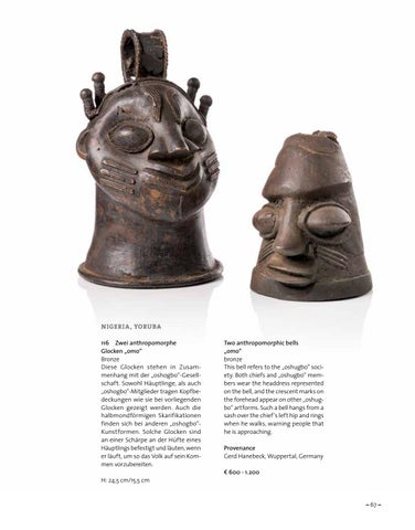 Two anthropomorphic bells „omo“ bronze This bell refers to the „oshugbo“ society. Both chiefs and „oshugbo“ members wear the headdress represented on the bell, and the crescent marks on the forehead appear on other „oshugbo“ artforms. Such a bell hangs from a sash over the chief‘s left hip and rings when he walks, warning people that he is approaching. Provenance Gerd Hanebeck, Wuppertal, Germany € 600 - 1.200