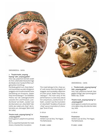INDONESIA - JAVA 2 Theatermaske „wayang topeng“ oder „wayang gedok“ Holz, Gips, polychrom bemalt, Sockel An ihrer unbemalten Rückseite trägt die Maske einen handschriftlich aufgebrachten Schriftzug. Die Maske gehört zum „Panji-Zyklus“ mit Geschichten aus dem Königreich Janggala und ist wahrscheinlich eine Darstellung von Kronprinz „Raden Panji Asmarabangun“. Ein beliebtes Thema war die Liebesgeschichte zwischen ihm und Prinzessin „Candra Kirana“ von Kediri. „Candra“ war die Inkarnation von „Dewi Rathi“ (der Göttin der Liebe) und „Panji“ die Inkarnation von „Kamajaya“ (dem Gott der Liebe). Theatre mask „wayang topeng“ or „wayang gedok“ wood, gypsum, polychrome painted, base On its unpainted backside the mask shows a handwritten inscription. –8–