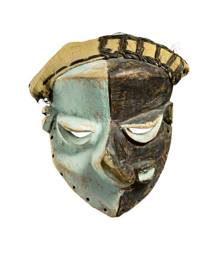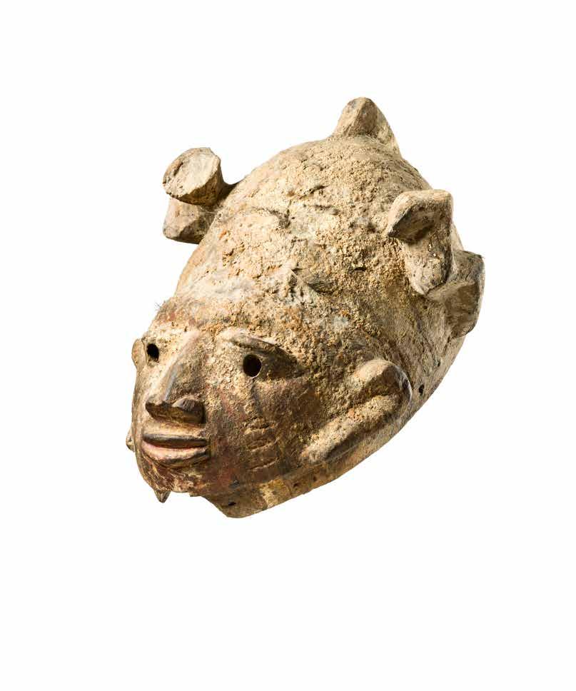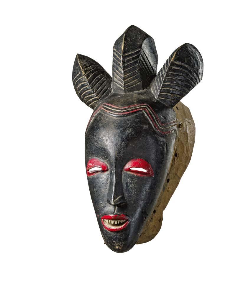 The „kpan pre“ mask type from the „goli“ mask cycle represents a young girl and is usually depicted with two horns in honour of the buffalo god „goli“.