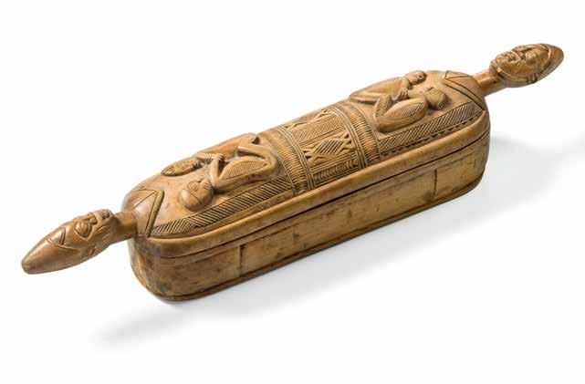 Oval bowl with figurally carved lid (hunting scene) blackened wood, rest. Such elaborately carved bowls with figuratively decorated lids were tradi tionally given to particularly honoured guests.