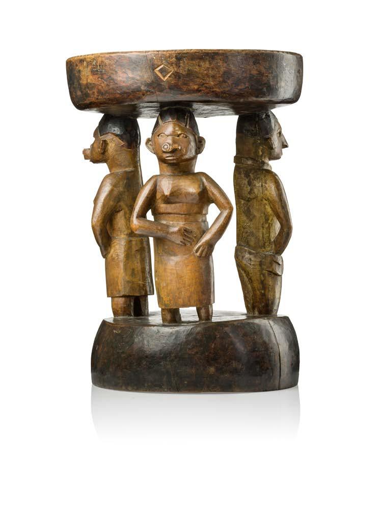 Caryatid stool with three figures wood, pigments, remains of an old coll ection label, rest., small missing part This stool is an example of a particu larly high quality Makonde carving.