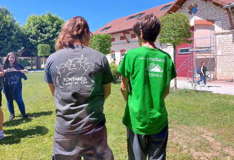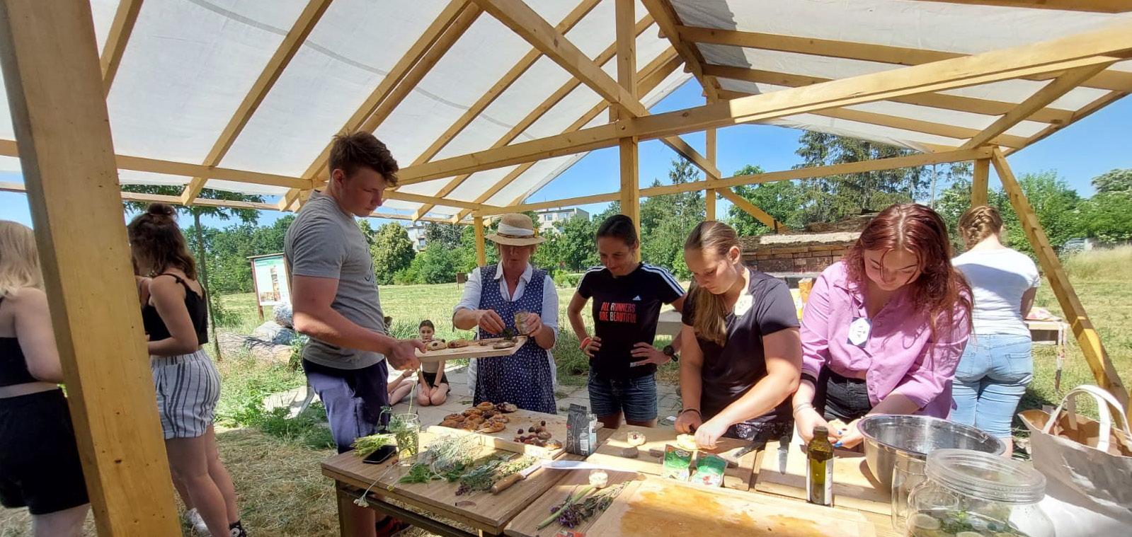 normálně nosit. Já přetvářím fialové tričko s krát kým rukávem. Práce mi jde docela od ruky. Nej dříve jsem ustřihla rukávy a nastřihla kraje. Po chvilce jsem řádila s barvami. Za pomoci ochotné paní Dany jsem přišila pruhy záclony na dokres lení netradičního vzhledu trička. Následně jdu k peci ochutnat chlebovou placku. Něco tak dobrého jsem ještě nejedla! Z dálky vidím, jak pan učitel povídá o agroekologii. Navštěvuji poté i hodinu anglického jazyka, kde studenti konverzují o ekologii, recyklaci a plýtvání. Na chvíli se mezi ně zapojím. Den se pomalu chýlí ke konci. Ráda bych nalákala všechny ostatní studenty, aby se na tuto akci při šli za rok podívat, protože ekologie v moderním pojetí je úžasná a zajímavá.