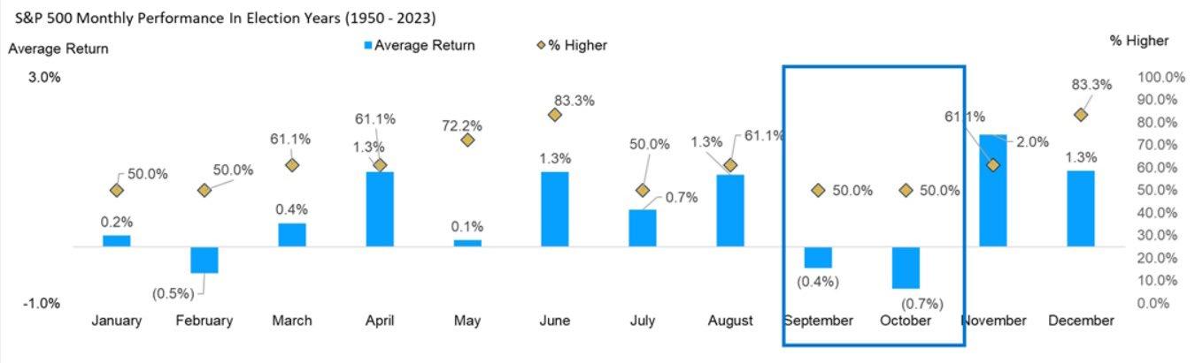 ¿Seguimos optimistas y alcistas? Sí, seguimos sobreponderados en acciones, como hemos estado desde diciembre de 2022. Sin embargo, no podemos ignorar el potencial de cierta inestabilidad antes de las elecciones y una debilidad estacional en los próximos meses. Septiembre ha sido el peor mes del año en los últimos 10 años, 20 años y desde 1950. En años electorales, es el tercer peor mes. De hecho, febrero y octubre han sido peores.