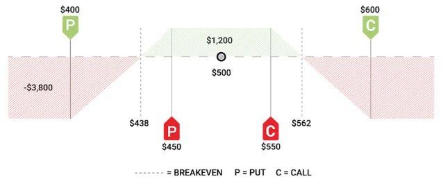 Para esta estrategia se requieren dos contratos call y dos contratos put con diferentes precios strike y la misma fecha de expiración. Se busca comprar y vender simultáneamente esos contratos.