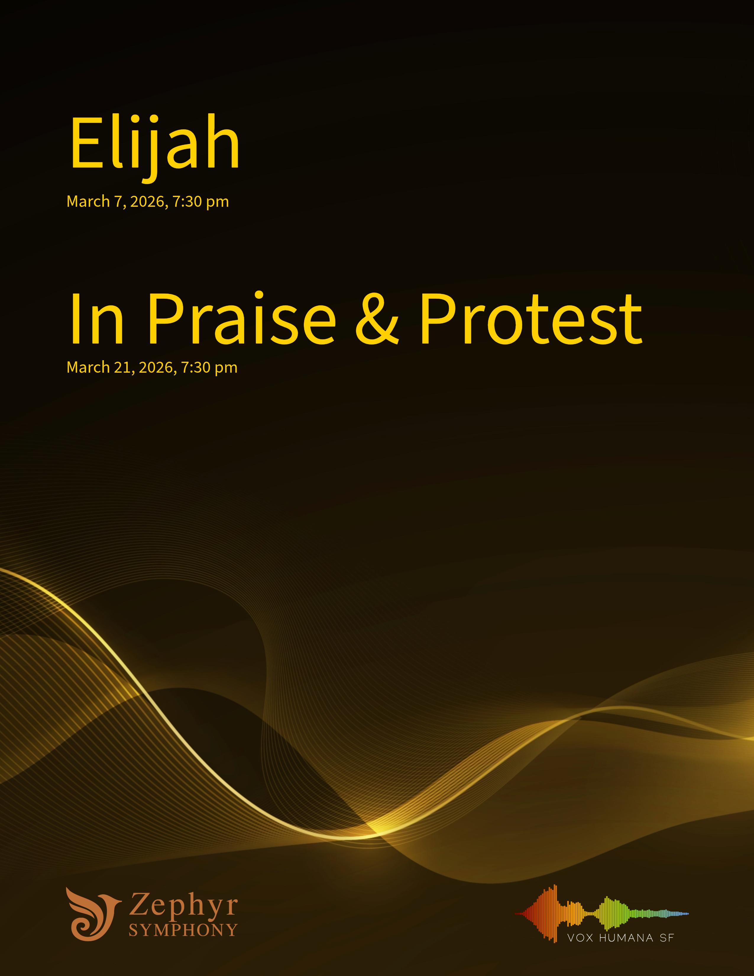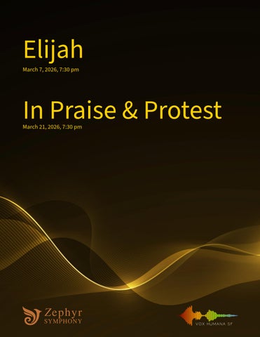 It is my joy to welcome you this evening for Zephyr Symphony & Chorus’, performance of Mendelssohn’s Elijah or Vox Humana SF’s In Praise & Protest. Your presence transforms the concert hall into a shared space of curiosity, reflection, and celebration, and we are delighted to have you with us.