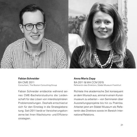 Richtete ihre akademische Zeit konsequent an dem Wunsch aus, einmal in einem Kunstmuseum zu arbeiten – von Seminaren über Ausstellungsprojekte bis hin zu Praktika. Arbeitet jetzt am Städel Museum als Referentin des Direktors sowie im Bereich International Relations.