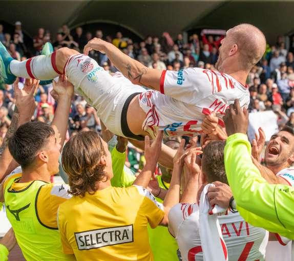 I biancorossi portano in trionfo e acclamano Kevin Vinetot al termine dell’ultima gara di campionato: dopo sette anni ricchi di soddisfazioni, il difensoretra gioia e commozione - chiude la bella esperienza in maglia FCS, alzato al cielo dai compagni di squadra in segno di affetto e gratitudine, tra gli scroscianti applausi di un “Druso” pressoché sold out. Applausi estesi a tutta la squadra, a tutti gli artefici della gigantesca impresa culminata con la conquista anticipata della permanenza tra i cadetti.