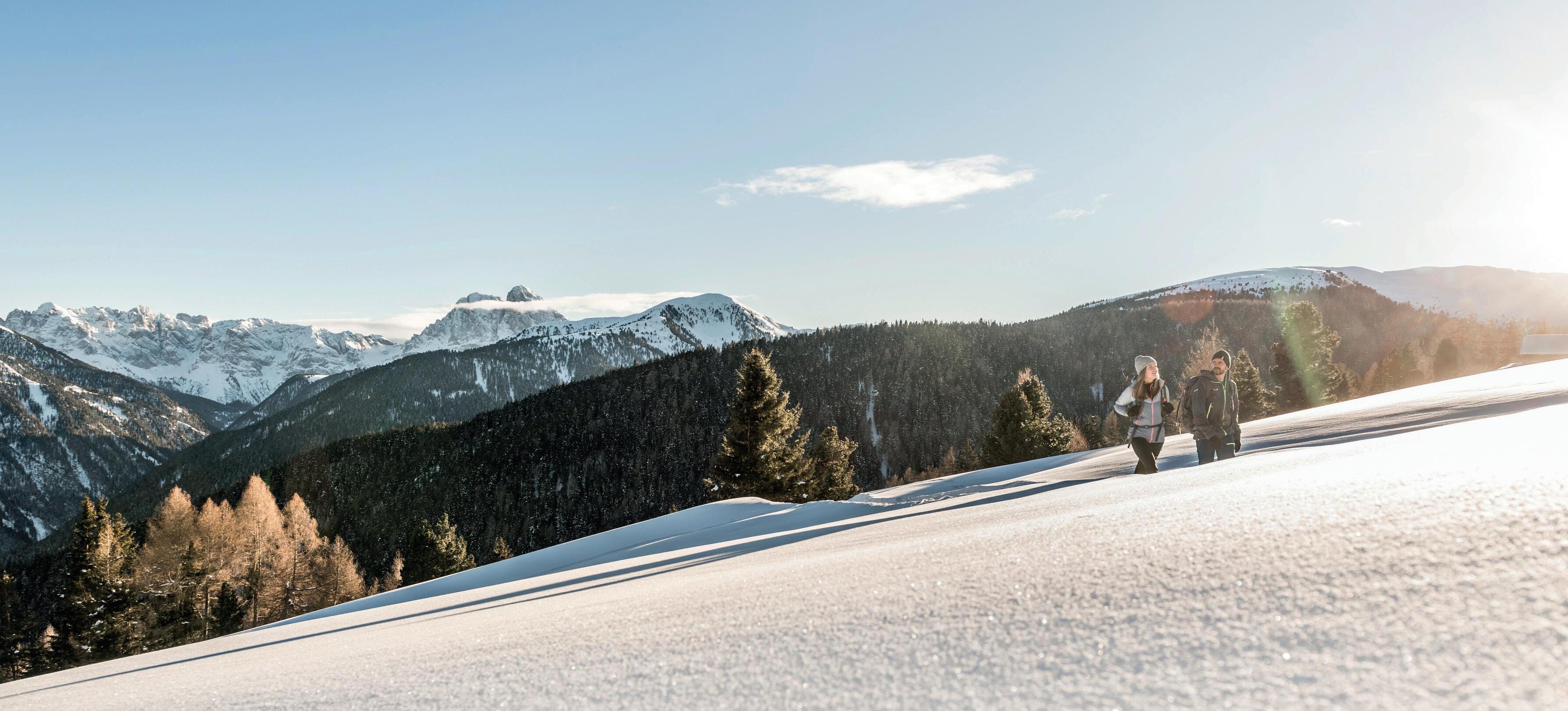 L’aria invernale, fresca e cristallina, è la più pura fonte di rigenerazione per corpo e spirito. A piedi o comodamente con la cabinovia, potete raggiungere l’Alpe di Siusi, il comprensorio sciistico Obereggen o Reinswald: ogni meta merita di essere esplorata.