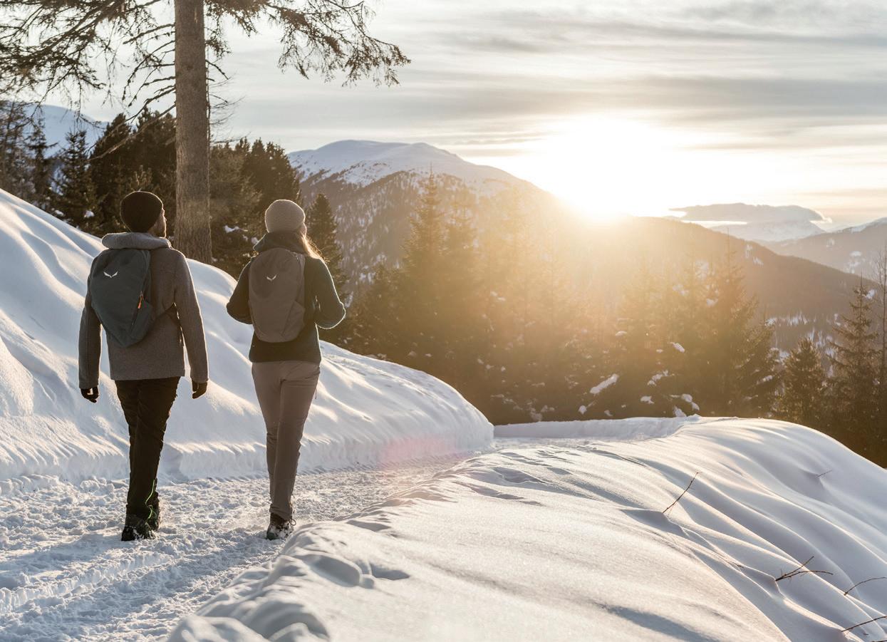 Südtirol Alto Adige è il regno delle escursioni, anche in inverno: è proprio in questa stagione che tour sui sentieri tracciati Vi consentono di scoprirne il lato tranquillo, raggiungendo belvedere, boschi innevati e invitanti rifugi, sparsi per l’intera regione. Calzature alpine impermeabili, abbigliamento traspirante, guanti, berretto, bastoncini da trekking, borraccia e la merenda nello zaino contribuiscono a rendere perfetta ogni escursione invernale.