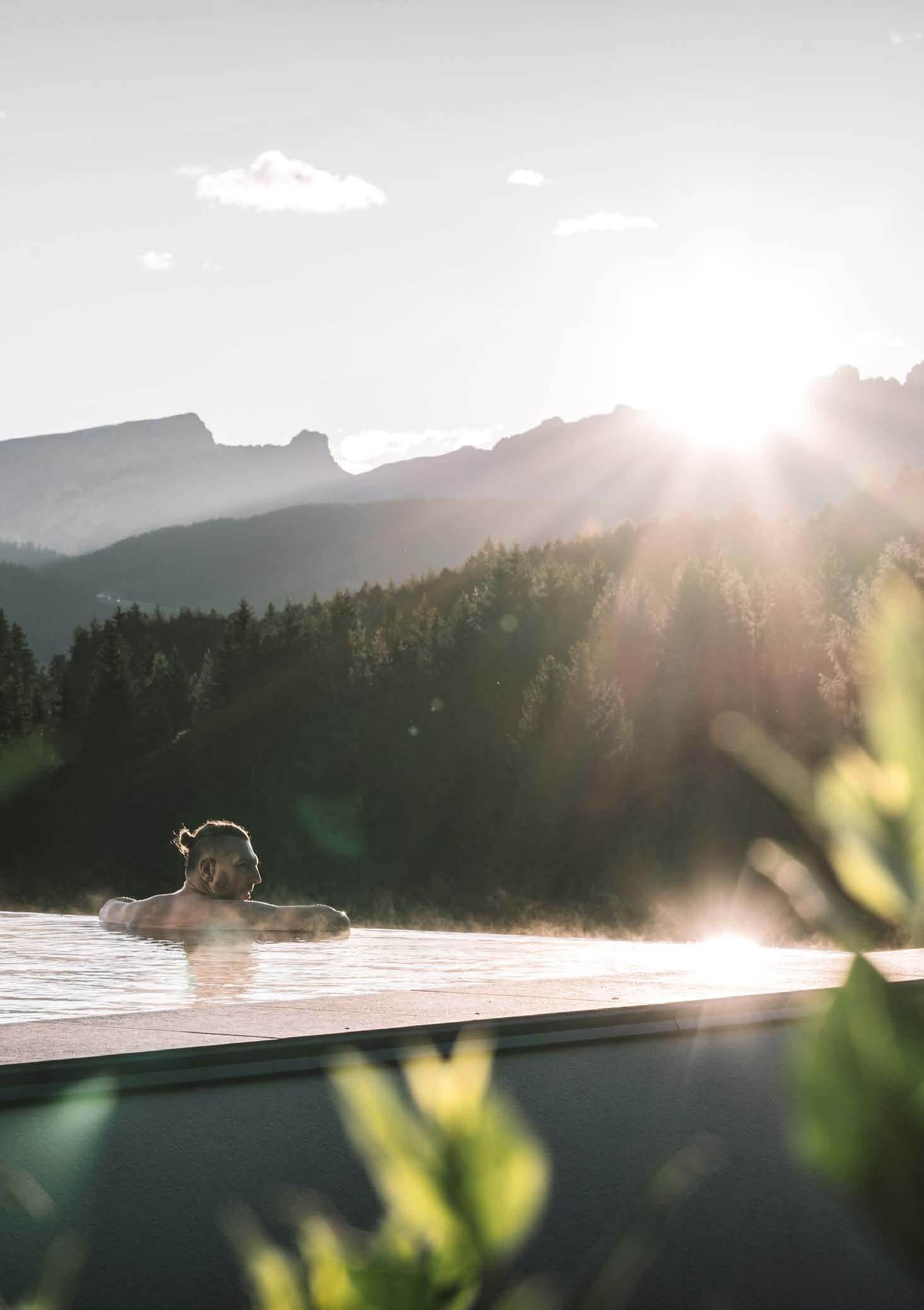 Schweben, leicht sein, entspannen im warmen, heilsamen Solewasser mit einzigartigem Blick auf die umliegenden Dolomiten, dem Rosengarten, Latemar und Schlern.
