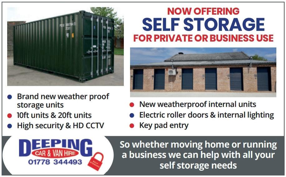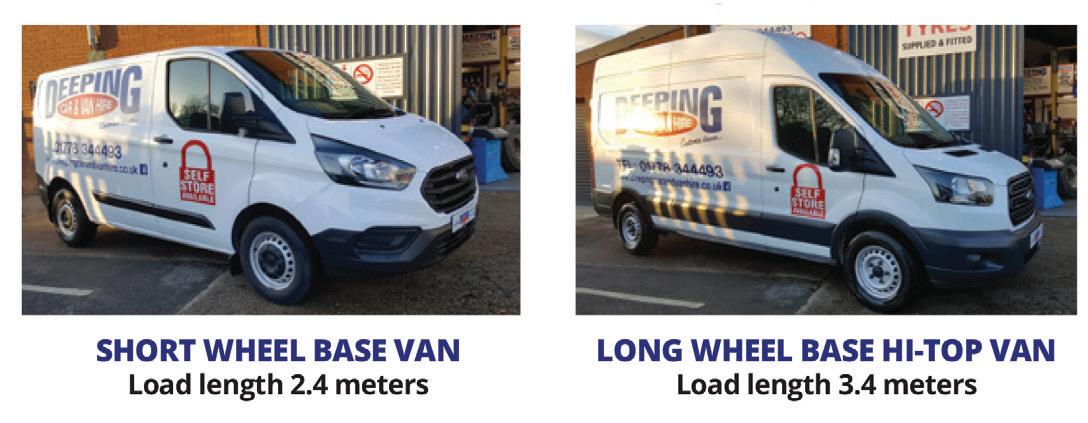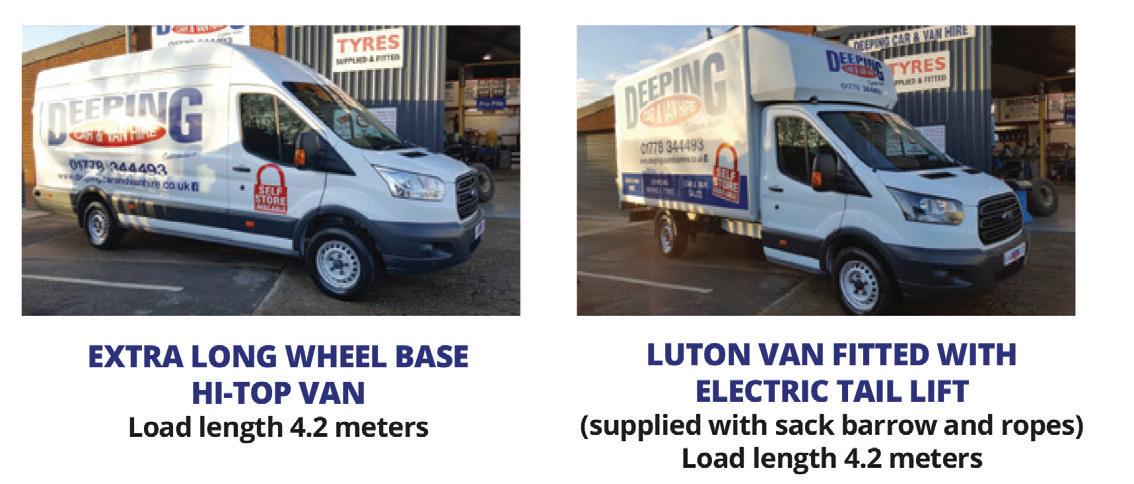 6 Vans and cars ideal for the job you need. EXTRA LONG WHEEL BASE HI-TOP VAN Load length 4.2 meters NOW SELF FOR PRIVATE ● New weatherproof ● Electric roller ● Key pad entry BOX SHOP NOW OPEN FOR ALL YOUR PACKAGING AND isit us at Boundary Garage, Main Road, PE11 3DL (opposite speed camera) For more information call 01778 info@deepingcarandvanhire.co.uk Visit our website: www.deepingcarandvanhire.co.uk So whether moving a business we self CAR HIRE Budget Cars ● Small 7 Seaters Manual & Automatic ● Brand new weather proof storage units NOW OFFERING SELF STORAGE FOR PRIVATE OR BUSINESS USE For more information call 01778 344493 Email: info@deepingcarandvanhire.co.uk Visit our website: www.deepingcarandvanhire.co.uk So whether moving home or running a business we can help with all your CAR HIRE Budget Cars ● Small and Large Cars Petrol / Diesel Brand new weather proof Vans and cars ideal for the job you need. EXTRA LONG WHEEL BASE HI-TOP VAN Load length 4.2 meters Customer driven... NOW SELF FOR PRIVATE ● New weatherproof ● Electric roller ● Key pad entry BOX SHOP NOW OPEN FOR ALL YOUR PACKAGING AND isit us at Boundary Garage, Main Road, PE11 3DL (opposite speed camera) For more information call 01778 info@deepingcarandvanhire.co.uk Visit our website: www.deepingcarandvanhire.co.uk So whether moving a business we self CAR HIRE Budget Cars ● 7 Seaters Manual & ● Brand new weather proof storage units WNNER 2021/2022