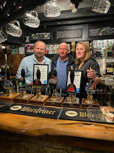 Matt Thompson (left) and Emma Freeman of the Five Horseshoes, Barholm celebrate a Gold Award and 10 consecutive years in the Good Beer Guide. Nominated by Andy Simmonds (pictured centre) and Alun Thomas from Peterbrough and District CAMRA.