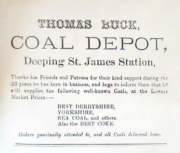Elizabeth (1849). During Thomas’s time many functions were held at the Inn, the most notable being the dinner held for the Ancient Order of Foresters who, looking very smart in their uniforms, marched through Market Deeping in time for dinner at the Inn at 2 o’clock, a custom which started in 1854. Pigeon shooting was another of the activities staged at the Inn as well as Ball and Card Assembly dancing. Jane died in 1857 and is buried in the Priory churchyard. Later that year, Thomas sold the iron foundry 60’x 20’ and all the tools advertising ‘a good business situated by the side of the Welland providing an unfailing supply of water’. Thomas had moved on and set up a coal business operating out of St James Deeping Railway Station with Thomas Lockwood from Tallington.
