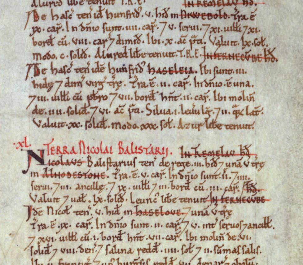 From Hascoit, the same Humphrey holds 5 hides in NEWBOLD PACEY. ere is land for 9 ploughs. In demesne are 4 ploughs, and 5 slaves; and 11 villans and 11 bordars with 8½ ploughs. ere are 10 acres of meadow. It was worth 60s.; now 100s. Alfred held it freely TRE. From Hascoit, the same Humphrey holds HASELEY. ere are 3 hides and half a virgate of land. ere is land for 2 ploughs. In demesne is 1 [plough]; and 3 villans with a priest and 7 bordars have 2 ploughs. ere is a mill rendering 4s., and 6 acres of meadow, [and] woodland 1 league long and 2 furlongs broad. It was worth 20s.; now 30s. Azur held it freely. NICHOLAS the crossbowman holds of the king 3 hides and 1 virgate of land in AILSTONE. ere is land for 5 ploughs. In demesne are 2 [ploughs], and 4 slaves and 3 female slaves; and 9 villans and 3 bordars with 3 ploughs. It was and is worth 60s. Leofric held it freely...