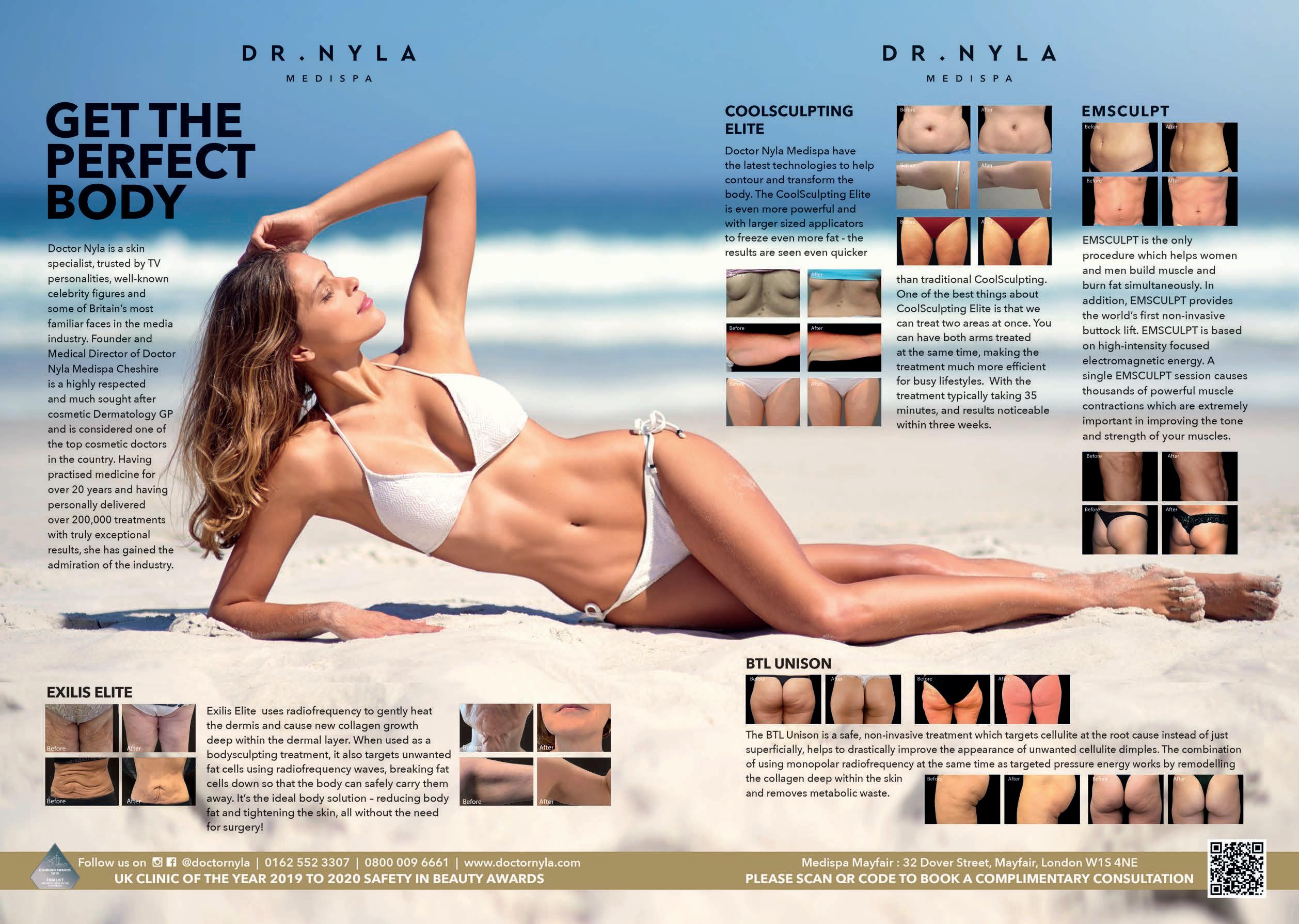 Dr Nyla is a highly sought-after skin and body contouring specialist, who has worked on clients with varying body types, providing them with the results they need to reach their goals. Unlike other fat reduction techniques such as liposuction, Dr Nyla offers treatments including CoolSculpting, Emerald Laser, skin tightening , Morpheus , cellulite removal all of which are totally non-invasive with no downtime. During the treatment, all you have to do is sit back, relax, and let the carefully programmed machine work its magic. A variety of areas can be treated, from the stomach, fl ank and thighs to the arms, back, buttocks and chin.