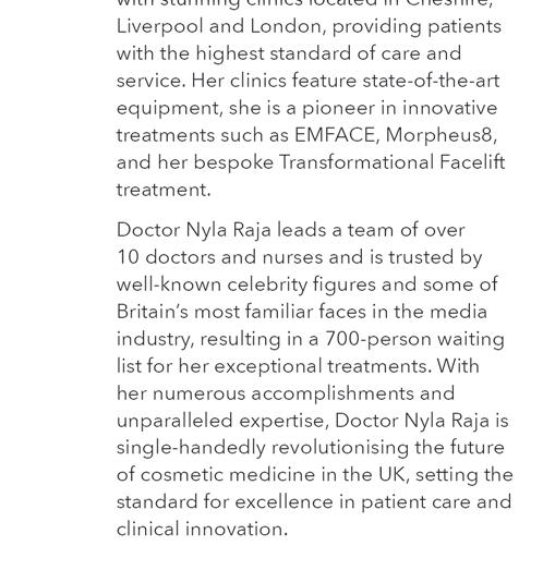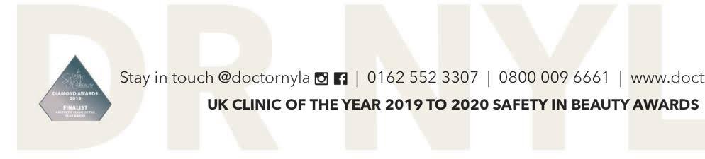 UK CLINIC OF THE YEAR 2019 TO 2020 SAFETY IN BEAUTY AWARDS Follow us on @doctornyla | 0162 552 3307 | 0800 009 6661 | www.doctornyla.com