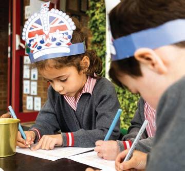 repurposing into thrones fit for a modern monarch. Everyone, from the Headmaster, administrative sta , school nurse to all classes, enjoyed researching the historical significance, roles, styles of thrones through the ages and society. Everyone avidly applied design and technology skills in anticipation of presenting their throne creations during the celebration picnic. The end result was a magnificent array of thrones, celebrating sustainability, the environment and community. Despite the best attempts of the rain (a somewhat British tradition), everything proceeded as planned. When the clouds parted and with the sunshine restored, everyone joined in to sing not only the National Anthem, but also a ‘happy 90th birthday’ for the school's 90th year.