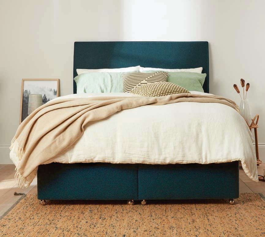Bed: Sandö I Fabric: Designer´s Guild Rothesay Zinc I Carpet: Soft Greige I Bed Linen: Storm Shell I Bedside table: Holme I Headboard: Rivö I Bed legs: Reling MADE BESPOKE WITH FABRICS FROM AND