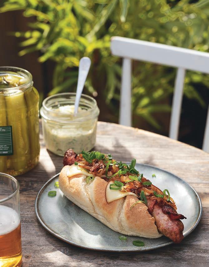 6 Place the hot dogs on a sturdy baking tray on the barbecue, put the lid on and leave for a minute or two so that the cheese becomes all gooey and melted. Transfer the hot dogs to plates and spoon on the German mayo. Scatter over the spring onions for freshness and serve.