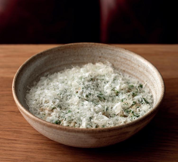There isn’t a grain of rice in sight in this tasty ‘risotto’, which is made using two di erent kinds of mushrooms instead. The process is relatively simple, we combine finely diced king oyster mushrooms with a creamy mushroom puree. Parmesan and fresh chives finish it beautifully.