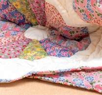 The SweetPea fabric quilt features a beautiful scallop design entirely patched from fi ve Liberty prints in a new sweet pea pattern. Hundreds of delicately hand cut patches are sewn together to make these quilts, £190. projektityyny.com
