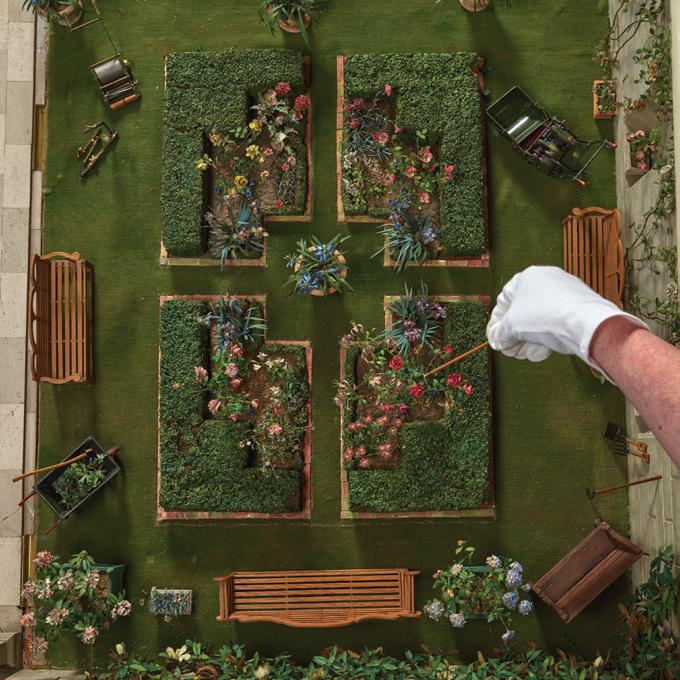 figures promenading and relaxing in the grounds of a series of royal residences, including Windsor Castle, Buckingham Palace and Hampton Court. The Dolls’ House itself has been re-lit to simulate daylight rather than moonlight, and the room’s ornate corner niches have been restored and filled with miniature plants and flowers, which were originally created as part of a seasonal scheme for the Dolls’ House Garden.
