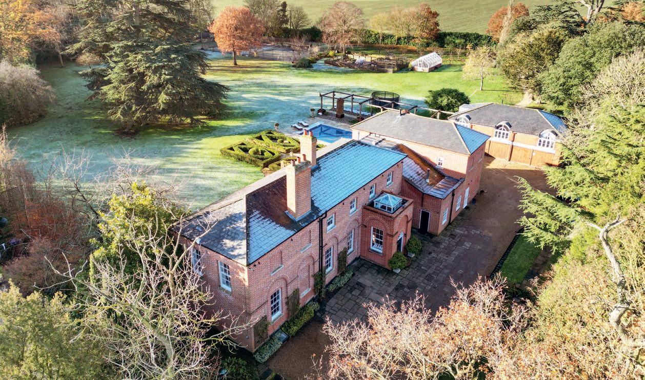 The property is accessed via a vaulted entrance hall with lantern roof, which leads into the impressive formal dining room, with beautiful French oak flooring, inset wood burning stove, sash windows to rear and front aspects, French doors opening onto the rear terrace and a door leading to the drawing room. The kitchen, which can be accessed from the dining room or the boot/utility room, is fitted with a range of bespoke hand-painted high-and low-level units. The sun/family room to the west wing of the house, part of the new twostorey extension constructed in 2012, o ers versatile, multi-functional contemporary living space. With five sets of doors opening onto the parterre, Indian sandstone terrace, swimming pool and garden, the room is light and airy, with a relaxed comfortable feel. To the first floor there is a substantial principal bedroom suite and five en-suite double bedrooms. The principal bedroom suite, which occupies a dual-aspect location in the original part of the house, has recently undergone refurbishment to an exceptionally high specification. The new extension incorporates separate ground floor, self-contained accommodation with its own front door, 'The Annexe'.