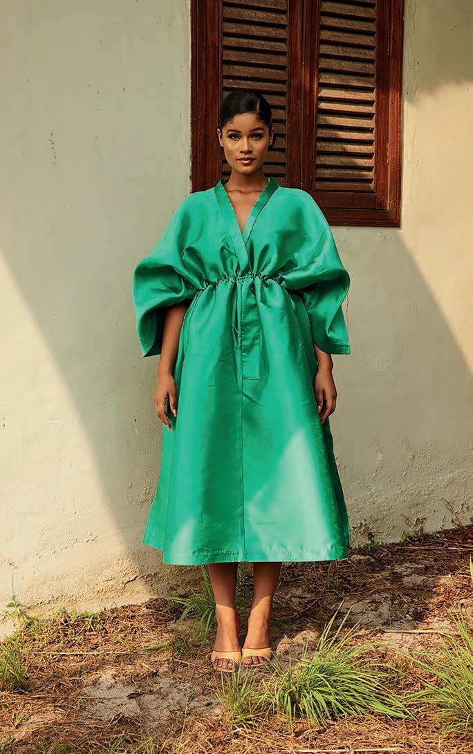 Pink City Prints' Tilda dress is the perfect party piece. Finished with an intricate, scalloped neckline, and fl attering, ruffl ed sleeves, it looks great with gold heels, or thrown on with brown boots. pinkcityprints.com