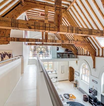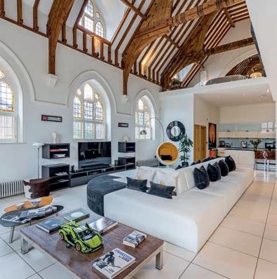 Upon entering the premises through an impressive gothic-styled brick arch surround, one is immediately struck by the grandeur of the space. The high ceilings, original stained glass windows, and oak doors and beams e ortlessly blend with the cutting-edge interior design, creating a truly mesmerising ambiance. The reception area, divided into three sections, includes a main reception room, a dining room, and a workstation. Additionally, the ground floor encompasses a utility room, a WC, and a generously sized storage cupboard. Access to the upper level is granted by a curved staircase, leading to a long landing that overlooks the magnificent nine-metre-tall vaulted living area. Two bedrooms, separated by the landing, feature en-suite bathrooms and dressing areas with the principal bedroom boasting a spacious walk-in wardrobe. For storage, there is a two-storey loft space accessed from the principal bedroom.