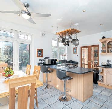 The property o ers a front driveway with tandem parking for two vehicles. The south facing private garden has recently been uplifted to include new composite decking. Notable features of this extraordinary home include a state-of-the-art alarm system, a comprehensive CCTV security system, underfloor heating throughout the property, and an impressive 106 indoor spotlights, the majority of which can be controlled remotely.