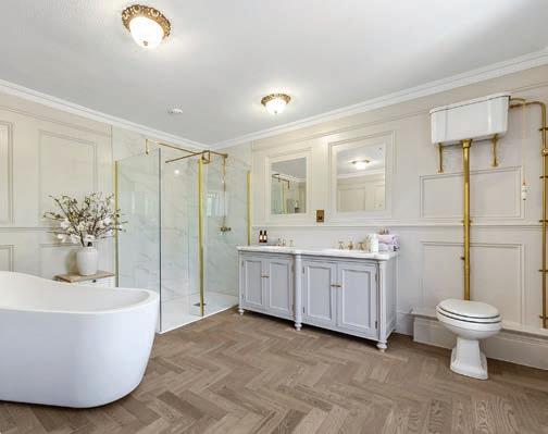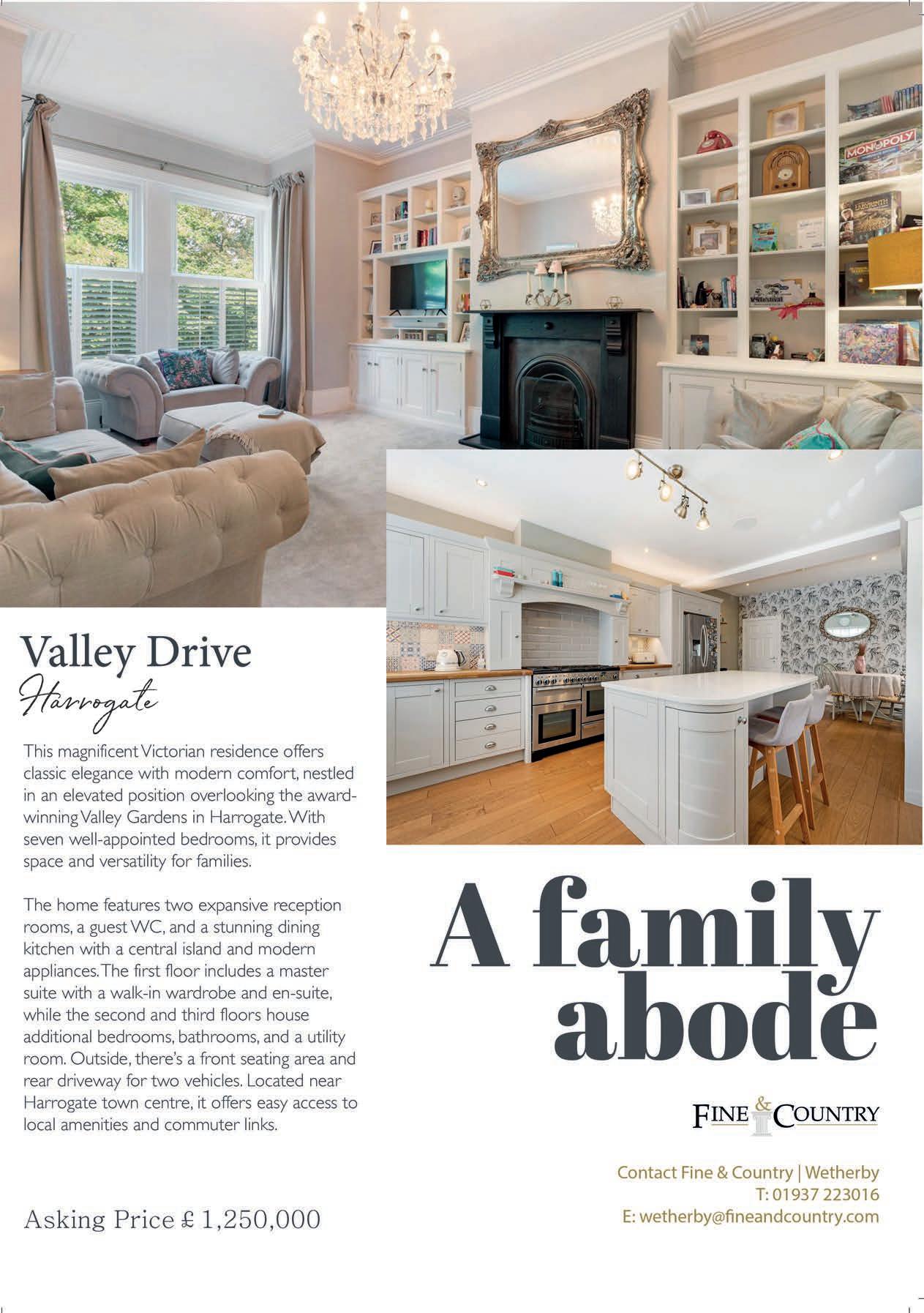 The grand entrance hall, accessed through original oak doors, boasts marble-tiled flooring, a dado rail, and a laylight that floods the space with natural light. The living room features original coving, Georgian oak plank flooring, a stone fireplace, and French doors leading to a Yorkshire stone courtyard. A second sitting room o ers ornate cornicing, parquet flooring, and floor-to-ceiling windows overlooking the gardens. The modern kitchen is fully equipped with integrated appliances, ample storage, and a utility room for convenience. The home has five generous bedrooms, including a master suite with a dressing room and luxurious en-suite bathroom.