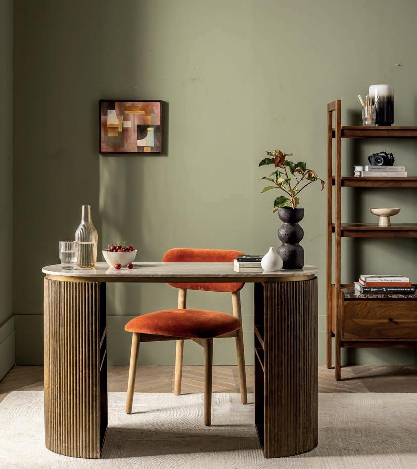 Marble Collection which marries tactile fluted wood with brass details and a stunning marble top; and the Reeves parquet wood dining table which has a stunning cross frame brass base.